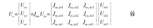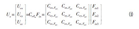 式中:向量[Uox Uoy Uoz]T3個分量—X、Y方向上的位移和繞Z軸轉(zhuǎn)動角度;[Fin1 Fin2 Fin3]—施加在如圖1所示的驅(qū)動端的輸入力,柔度矩陣CoFin的每一列表示在某一驅(qū)動力對輸出位移的影響,其每一行表示所有驅(qū)動力對某一方向輸出位移的作用。