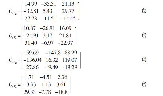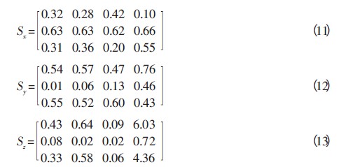 (2)測量輸出端的各個位移,則可以得到相應(yīng)的柔度矩陣的某一列元素,則可以得出四種不同柔性鉸鏈平臺的柔度矩陣分別如下: