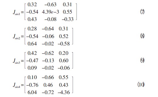 同理,根據(jù)雅可比矩陣的定義關(guān)系式,應(yīng)用軟件ANSYS獲得雅可比矩陣的過程為:(1)分別在載荷端施加單位位移(1);(2)測量動平臺中心的位移,則可以得到相應(yīng)的雅可比矩陣的某一列元素,則可得出四種構(gòu)型的機(jī)構(gòu)的雅可比矩陣分別如下: