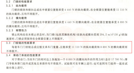 可以清楚的看到,門鉸鏈的性能要求明確在承受一定的載荷而不得脫開,我們來看一看具體數(shù)值。