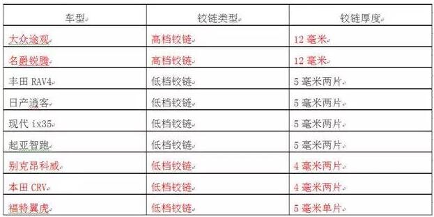 20萬元左右SUV車門鉸鏈對(duì)比表