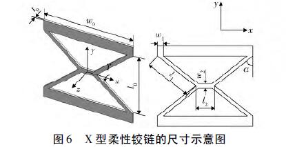 為說(shuō)明Deform-X柔性鉸鏈的性能,選取相同外形的X型柔性鉸鏈,即鉸鏈寬度為w0,長(zhǎng)度為l0,厚度為t0,鉸鏈角度α為45°,其尺寸示意如圖6所示,尺寸參數(shù)如表4所示。