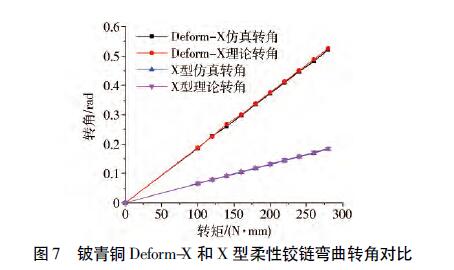 (2)通過(guò)將Deform-X柔性鉸鏈與具有相同外形尺寸X型柔性鉸鏈的對(duì)比,表明在相同轉(zhuǎn)矩作用下,Deform-X柔性鉸鏈可以實(shí)現(xiàn)更大的彎曲變形。
