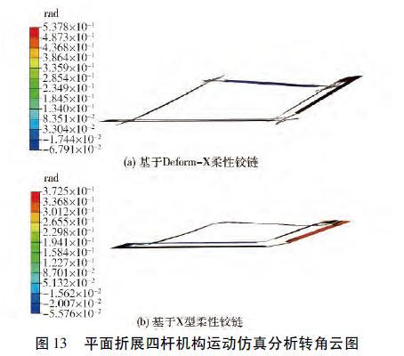 同理,在ABAQUS中建立相同外形尺寸的基于X型柔性鉸鏈平面折展四桿機(jī)構(gòu)仿真模型如圖11b所示,分析結(jié)果如圖13b所示,在同樣力矩作用下,該四桿機(jī)構(gòu)搖桿B末端位移s為23.40mm,角度α1為15.21°、α2為19.29°,因此,基于Deform-X柔性鉸鏈的平面折展四桿機(jī)構(gòu)變形性能優(yōu)于基于X型柔性鉸鏈的平面折展四桿機(jī)構(gòu)。