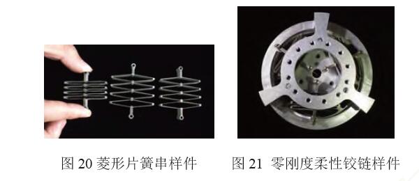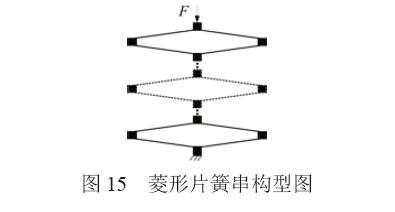 傳統(tǒng)壓簧的剛度和尺寸難以精確定制,且應(yīng)用時多需要導(dǎo)向機(jī)構(gòu)。因此,提出一種剛度和尺寸可 以定制的彈簧——菱形片簧串。菱形片簧串(圖15) 由多個菱形片簧串聯(lián)構(gòu)成,具有結(jié)構(gòu)設(shè)計(jì)自由,定 制度高等特性,其加工工藝與柔性鉸鏈一致,均采 用精密線切割加工。