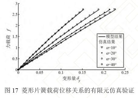 菱形片簧載荷位移關(guān)系的模型結(jié)果和仿真結(jié)果 對比如圖17 所示(量綱一化)。對四種不同傾斜角的 菱形片簧,模型與有限元仿真的結(jié)果相對誤差不超 過1.5%,式(24)模型的有效性和準(zhǔn)確性得到驗(yàn)證。