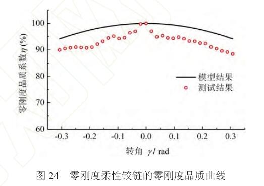 利用測試平臺對內(nèi)外環(huán)柔性鉸鏈和零剛度柔性鉸鏈的轉(zhuǎn)動剛度進(jìn)行測試,測試結(jié)果如圖23 所示。 根據(jù)式(19)計(jì)算并繪制零剛度柔性鉸鏈的零剛度品 質(zhì)曲線,如圖24 所示。