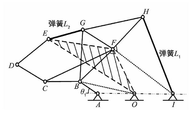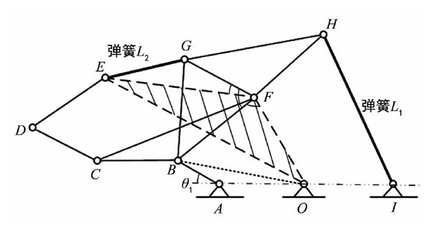 如圖7所示, 將該機構分解成兩個四連桿機構, 并通過解析法求解鉸鏈彈簧L1的運動規(guī)律。