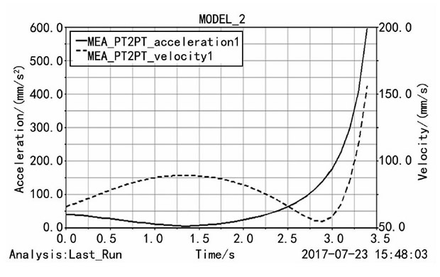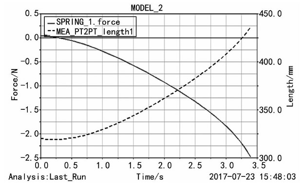 通過分析鉸鏈彈簧的特性, 計算出彈簧在拉伸和壓縮過程中的行程和作用力曲線圖。分別設定4個測量值:鉸鏈彈簧的長度MEA_PT2PT_length、運動速度MEA_PT2PT_velocity、鉸鏈彈簧的加速度MEA_PT2PT_acceleration和鉸鏈彈簧的作用力MEA_PT2PT_force。