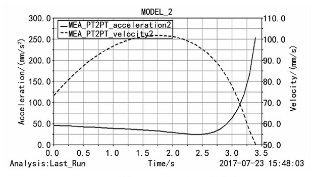 如圖14所示, 在盒蓋開始關閉過程中, 彈簧L2的速度慢慢大, 通過最高點后, 速度迅速變小, 最后達到關閉雜物盒的極限狀態(tài), 此時速度為0, 說明在關閉雜物盒過程中, 鉸鏈彈簧L2速度為正, 且一直處于拉伸狀態(tài)。盒蓋關閉速度先增大后變小直至為0, 從而避免因關閉速度過大產生較大響聲, 提高了雜物盒的操作耐久性。