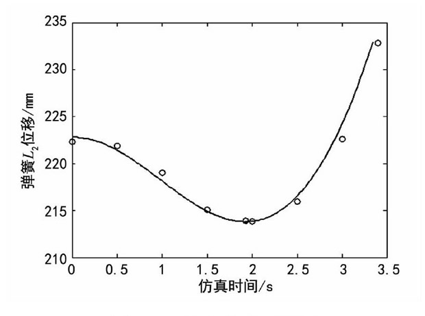 運行Matlab程序, 得出得出盒蓋在關閉過程中, 鉸鏈彈簧L2的運動曲線, 如圖10所示。 分析發(fā)現(xiàn), 隨著關閉時間的增大, 彈簧L2的位移逐漸減小, 在最小值時, 彈簧位移達到最小值。隨后彈簧L2的又迅速增大, 且位移最小值的坐標為 (t0, Lmin) = (1.93, 213.8) 。