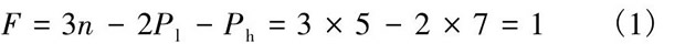 由于彈簧EG和HI長度可變, 因此不夠成約束, 先忽略彈簧連桿機構。如圖5所示, 該連桿之間采用旋轉副連接, 盒蓋的開啟和關閉運動是旋轉和平移的結合??梢钥闯? 該機構有唯一的運動軌跡[7]。