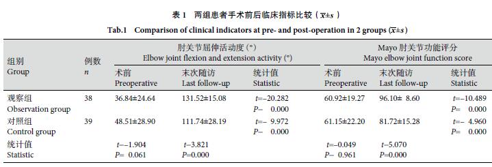 對照組:男28例,女11例;年齡16~59歲,平均33.7歲。致傷原因:創(chuàng)傷性21例,滑膜炎11例,骨關(guān)節(jié)炎7例。原始損傷診斷類型:肘關(guān)節(jié)損傷三聯(lián)征2例,鷹嘴骨折8例,經(jīng)鷹嘴骨折脫位2例,合并尺骨鷹嘴骨折6例,尺骨骨折2例,合并肱骨鷹嘴骨折3例,肱骨骨折12例,橈骨骨折4例。受傷至手術(shù)時間5~210個月,平均30.1個月。兩組患者性別、年齡、致傷原因、原始損傷診斷類型、受傷至手術(shù)時間及術(shù)前肘關(guān)節(jié)屈伸活動度、Mayo肘關(guān)節(jié)功能評分等一般資料比較差異均無統(tǒng)計學(xué)意義(P>0.05),具有可比性。見表1。