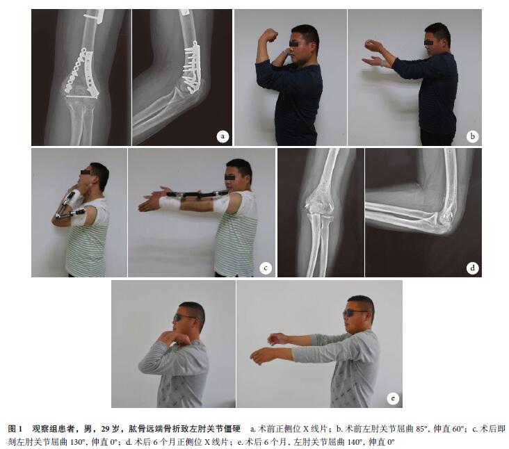 觀察組:男25例,女13例;年齡23~62歲,平均35.9歲。致傷原因:創(chuàng)傷性27例,滑膜炎6例,骨關(guān)節(jié)炎5例。原始損傷診斷類型:肘關(guān)節(jié)損傷三聯(lián)征5例,鷹嘴骨折6例,合并尺骨鷹嘴骨折2例,尺骨骨折5例,合并肱骨鷹嘴骨折3例,肱骨骨折10例,橈骨骨折7例。受傷至手術(shù)時間6~240個月,平均27.5個月。