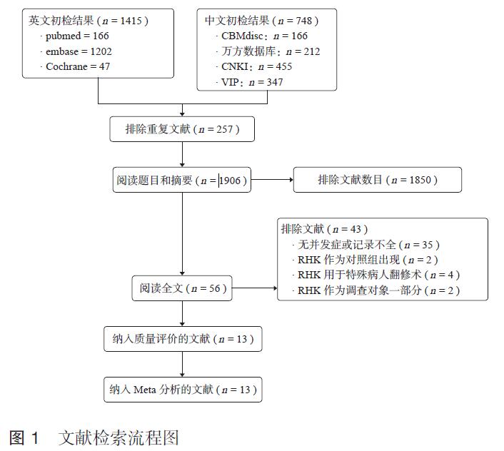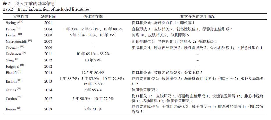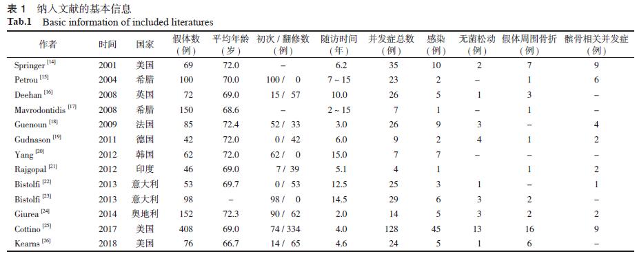 一、文獻檢索結果共檢索出1906篇文獻,通過題目、摘要及全文閱讀,最終納入13篇旋轉鉸鏈式膝關節(jié)假體置換術后并發(fā)癥發(fā)生率的文獻[14-26]。均為觀察性研究總樣本例數為1416例,354例發(fā)生并發(fā)癥。納入文獻的基本情況見表1,2。