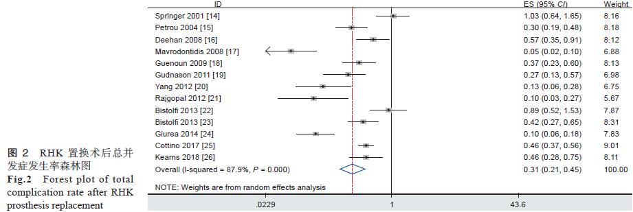 1.總并發(fā)癥發(fā)生率:納入13篇文獻,異質性檢驗I2=87.9%,因此采用隨機效應模型。結果顯示:RHK術后總并發(fā)癥發(fā)生率為0.31,95%可信區(qū)間估計值(0.21,0.45)(圖2)。經公式轉化后結果為23.6%(95%CI:17.4%~31.0%)。