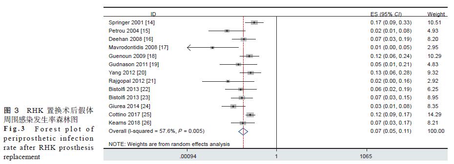 2.假體周圍感染發(fā)生率:納入的13篇文獻,研究總樣本例數為1416例,假體周圍感染101例,經異質性檢驗I2=57.6%,因此采用隨機效應模型合并13項研究術后假體周圍感染發(fā)生率為0.07,95%可信區(qū)間(0.05,0.11)(圖3)。公式轉化后結果為6.5%(95%CI:4.8%~9.9%)。