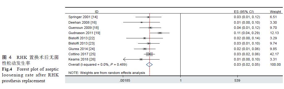 3.假體無菌性松動發(fā)生率:納入的9篇文獻,總例數1058例,其中假體無菌性松動例數31例,進行Meta分析。經異質性檢驗I2=0.0%,因此采用固定效應模型,術后假體無菌性松動發(fā)生率為0.03,95%可信區(qū)間估計值(0.02,0.05)(圖4)。公式轉化后結果為2.9%(95%CI:2.0%~4.8%)。
