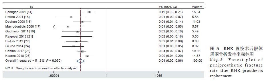 4.假體周圍骨折發(fā)生率:納入的10篇文獻,總例數1213例,假體周圍骨折40例。進行Meta分析,異質性檢驗結果I2=51.3%,因此采用隨機效應模型,結果顯示:RHK術后假體周圍骨折發(fā)生率為0.04,95%可信區(qū)間估計值(0.02,0.06)(圖5)。轉化后結果為3.8%(95%CI:2.0%~5.7%)。