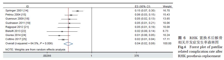 5.髕骨相關并發(fā)癥發(fā)生率:納入8篇文獻,納入總例數958例,術后髕骨相關并發(fā)癥發(fā)生例數35例。進行Meta分析,經異質性檢驗I2=84.5%,因此采用隨機效應模型進行合并。結果顯示:RHK術后假體周圍感染發(fā)生率為0.04,95%可信區(qū)間估計值(0.02,0.08)(圖6)。轉化后結果為3.8%(95%CI:2.0%~7.4%)。
